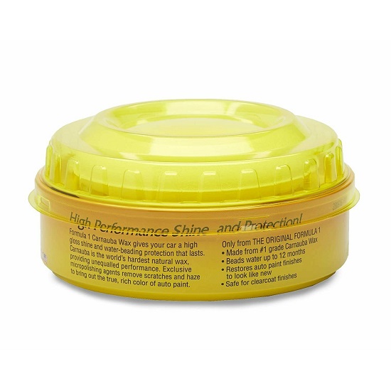 Formula 1 Car Wax restores automotive paint to its natural rich color and gives a glossy shine. Simply washing your car with shampoo won’t remove all the dirt and gunk that tarnishes paint. You’ll need the heavy duty strength of Formula 1 Carnauba wax that is safe for all paint finishes, including clear coats. This high performance wax contains advanced micropolishers that help fill in and remove minor scratches while clearing away hard-to-remove haze. This is great for deep-cleaning especially if your car has not been washed for a long time, or if it has water spots. Small contaminants are easily picked up by the wax as you wipe it away.
