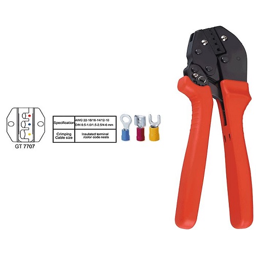 Heavy duty crimping Tool made with carbon steel (HRC 46) with black oxidized finish with interchangeable die nest, with ratchet mechanism system for perfect and reliable crimping. The jaws are designed with double plate to increase the life span of the tool. The handles are made with thermoplastic rubber for proper grip and comfortable Crimping.