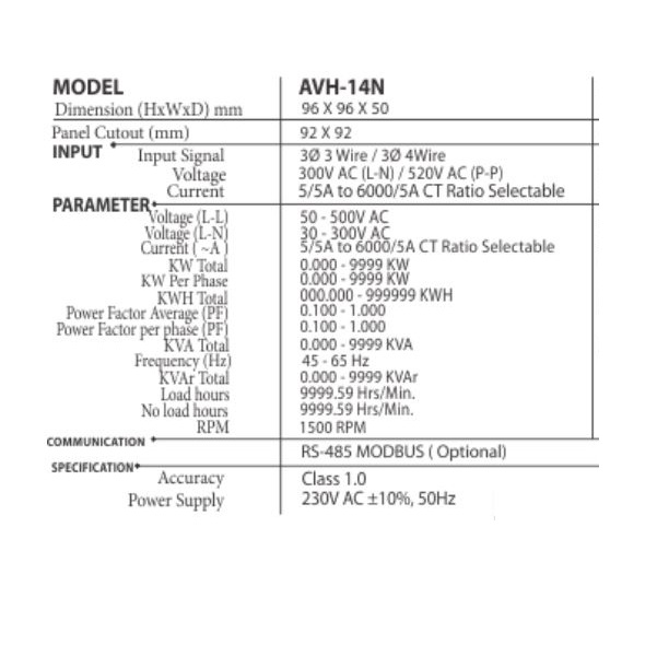 - Dimensions: 96x96 - 4 Line , 7 Segment LED Display - 3 Ph-3W/4W - 10 + Parameter with LED indication - CT Selectable up to 4000/5 - RS-485 MODBUS Communication