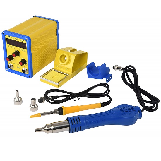 This is a sophisticated soldering station that is ideal for hybrid SMD rework. It comes with a soldering iron as well as a temperature controlled hot air blower attachment. It can be used at home for hobbyist and industrial purposes.