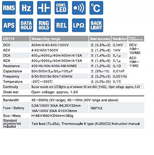 - 3-3/4 digits 4000 count - AC True RMS - Easy to read large LCD with Backlight - Large breaking capacity fuse 30kA - K-type thermocouple temperature measurement -20℃〜300℃ - Thermo plastic elastomer, high resistance against drop shock - Safety cap on current terminal - Data hold, Range hold, Relative function - Continuity check, Diode test - Auto power off function (30min.) - Maximum 20A can be measured if the measurement time is less than 10 seconds.